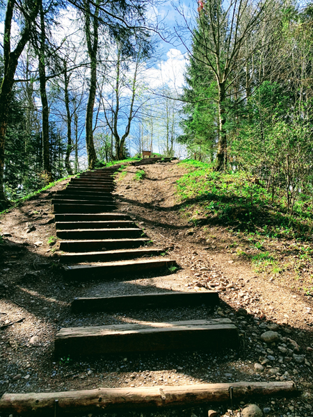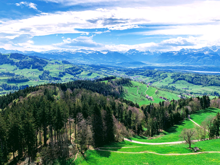 Gemütlich geht es weiter Richtung Wald und wir folgen wiederholt einfachen Wanderwegen. Das letzte Stück verläuft auf einem geteerten Weg, bis wir schließlich beim Bahnhof in Wald ankommen. Dort werden wir noch einen Schlusstrunk in einem Café zu uns nehmen. Beim Aussichtsturm angekommen haben wir eine gewaltige Sicht auf den Zürichsee und die Bergwelt der Glarner Alpen. Wer Lust hat, besteigt mit mir noch die 166 Stufen des Aussichtsturms – der Blick von oben ist wirklich sehr eindrücklich und sicherlich unvergesslich! Die Aussichtsplattform befindet sich auf einer Höhe von 30 Metern.